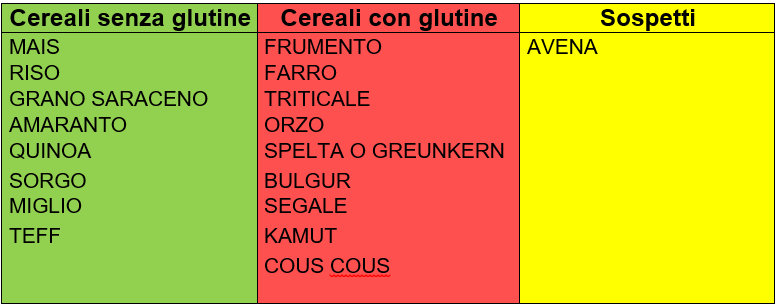 L’utilizzo dei cereali è da intendersi preferibilmente integrali, possiamo scegliere tra i vari cereali e variando inserirli dove già indicati nel piano (1-2 volte al giorno). Nel piano troverete comunque un paragrafo che indica i vari cereali e come sostituirli, sotto riporto una tabella con i cereali e loro derivati divisi per la presenza o meno di glutine. Il Mais avendo un indice glicemico alto è possibile usarlo, ad esempio come polenta, ma non più di una volta la settimana.