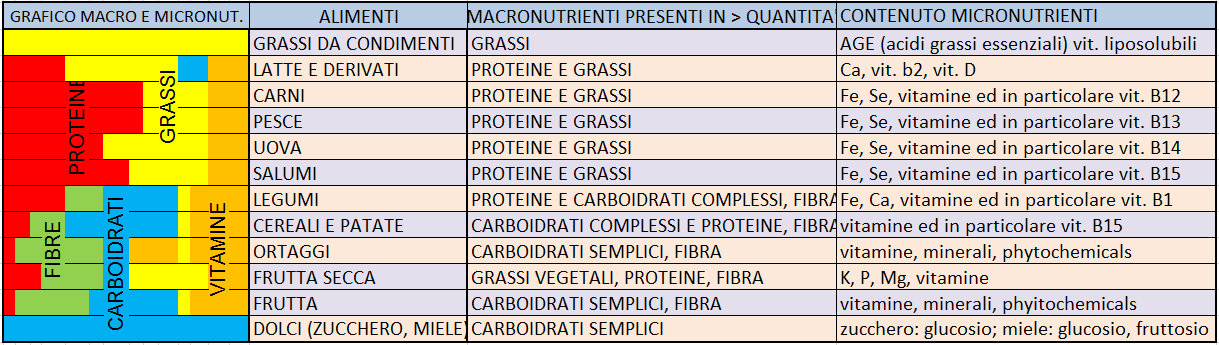 La tabella sotto vuole essere una semplificazione che illustra la composizione in macro e micronutrienti delle principali categorie di alimenti. Le barre colorate riportate sopra ad ogni categoria rappresentano le quantità approssimative di macro e micronutrienti presenti in quella categoria. Trattandosi di una semplificazione lo schema sotto non è assolutamente esaustivo ma vuole solo dare una idea al lettore che non conosce l'argomento.