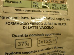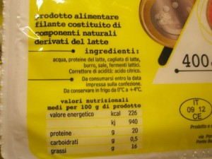 La mozzarella senza latte fresco.La mozzarella senza latte fresco esiste. Basta sciogliere in acqua calda la cagliata conservata (prodotta altrove 1-2 mesi prima o addirittura anni prima, se congelata), aggiungere sale, filare l’impasto e infine raffreddare e confezionare. Il sistema è molto rapido, non serve avere serbatoi refrigerati per il latte (liquido) e i costi di produzione oscillano da 2,5 a 3,5 €/kg, che raddoppiano nel listino al dettaglio. Il sapore è decisamente povero, il prodotto non ha il sapore tipico di fresco, il colore può tendere maggiormente al giallo (anche se questo non è di per sé un aspetto negativo), la struttura è meno “succosa” e, se si usa cagliata conservata da molto tempo, il prodotto “sa di formaggio” e non di latte fresco. Sull’etichetta dovrebbero essere indicati i seguenti ingredienti: cagliata, acqua, sale, seguiti dagli additivi: acido citrico, lattico e, a volte, sorbato di potassio. Tuttavia, poiché la legge non obbliga a riportare il termine “cagliata”, raramente viene dichiarato in etichetta (vedi foto a lato).