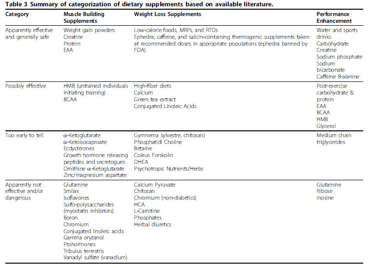 L’interessante articolo pubblicato su Journal of the International Society of Sports Nutrition nel 2010 (ISSN exercise & sport nutrition review: research & recommendations Kreider et al. Journal of the International Society of Sports Nutrition 2010, 7:7) classifica gli integratori utilizzati nella pratica sportiva come sotto riportato